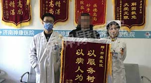 济南患者小宋1年多前患上精神分裂症,在多地治疗效果都不好。前段时间因病情加重入住我院,经1个月治疗,症状全部消失,康复出院,为感谢医护人员的精心医治和护理,特送来锦旗表示感谢。