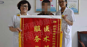 山东德州71岁的李大妈,退休在家。患抑郁症已经4年了,在家度日如年,天天要寻死,到多地医院辗转治疗,都没有任何效果。在我院经过2个半月治疗,完全康复,今天李大妈和家人一起来到医院,把锦旗送给刘海英主任,激