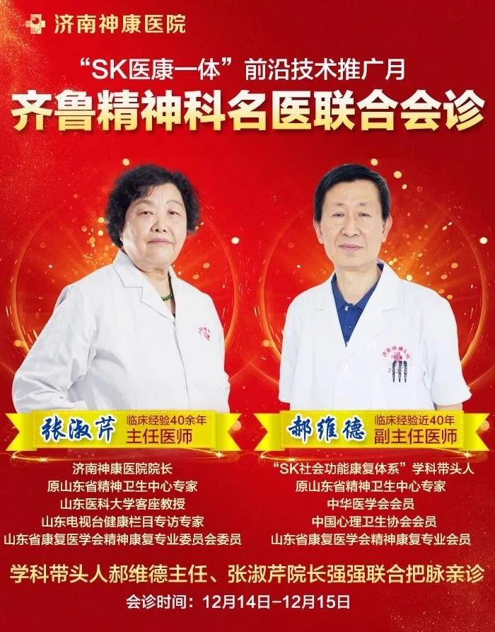 日前,为期两天的首期齐鲁精神科名医会诊活动完满落下帷幕。“SK医康一体”学科带头人、原山东省精神卫生中心郝维德主任,原山东省精神卫生中心主任医师、济南神康医院张淑芹院长上周末联合会诊,引发患者及其家属的强烈反响,预约号很快被“一抢而空”,有不少外地患者未能挂到会诊号,应广大患者强烈要求,第二期齐鲁精神科名医会诊在12月14日、15日再次启动。为保障就诊质量,每日限20个名额,抢约热线:0531-88190909!